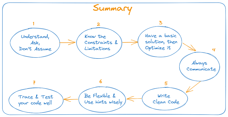 عند الانتهاء من كتابة الكود في الانترفيو، لا ينتهي دورك بعد ذلك. من المهم أن تقوم بعمل tracing و testing للكود الذي قمت بكتابته. يجب عليك التأكد من أن الكود يعمل كما هو متوقع، وأنه يُغطي جميع الحالات الممكنة وال edge cases. نفس الشئ مهم على أرض الواقع، لإنتاج مشاريع بها أقل نسبة مشاكل ممكنة.