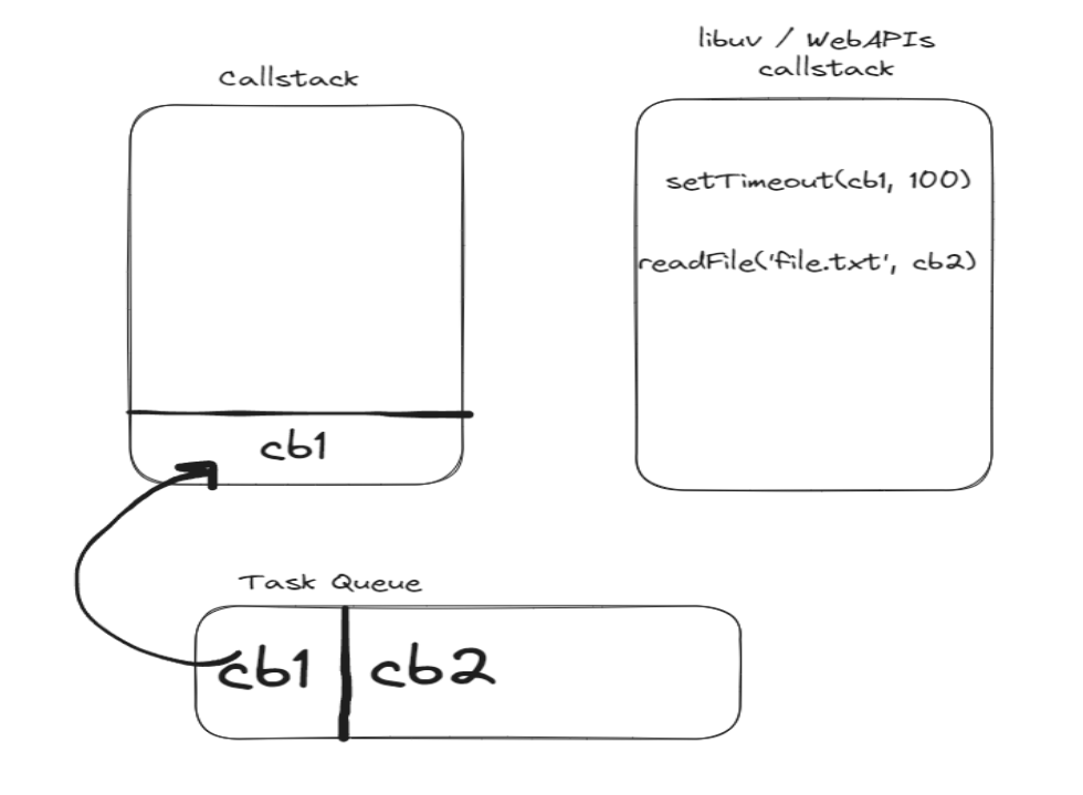دعني أعرفك أن JavaScript تعتبر لغة ذو Thread واحد فقط، أي يمكنها تنفيذ شيء واحد فقط في آن واحد، مما يعني أن لديها Call Stack واحد فقط (هي تعتبر هيكل بحيث نقوم بوضع فيه الدوال التي ستنفذ حسب ترتيبها في الكود بشكل رأسي. يمكنك تشبيهها بالصحون المرتبة فوق بعضها، حيث أنه لا يمكنك أن تأخذ صحن من وسط الصحون، و أن الطريقة الوحيدة لأخذ هذا الصحن هو إزالة جميع الصحون فوقه)، بمعنى أنه في ذلك الكود أننا نقوم بوضح أول console.log في البداية وبعدها من المفترض وضع تلك الدالة الasynchronous ولكن ذلك لن يحدث لأنها توضع في callstack آخر خاص بالـ”libuv APIs” (إذا كان ذلك الكود تقوم بتشغيله باستخدام Node.js) أو WebAPIs (إذا كان ذلك الكود تستخدمه في المتصفحات) ومن ثم تلك الدوال المتواجدة في الـstack الخاص بها لديها الـCallback function الخاص بها، وعند انتهاء أيًا منهم. نقوم بعد ذلك في هيكل آخر يدعى Task queue (ويعد الـ queue هنا هو هيكل آخر نخزن فيه البيانات بشكل أفقي مثل طابور الدفع في المتاجر بالضبط، حيث أن أول شخص يقف بالطابور هو أول شخص يحاسب صاحب المتجر ويليه من يقف وراءه) وتبدأ تلك الـ callback functions داخل الـqueue بالإنطلاق وتنفذ بداخل الـcallstack الأساسي وينفذ فيها ما يُراد تنفيذه.