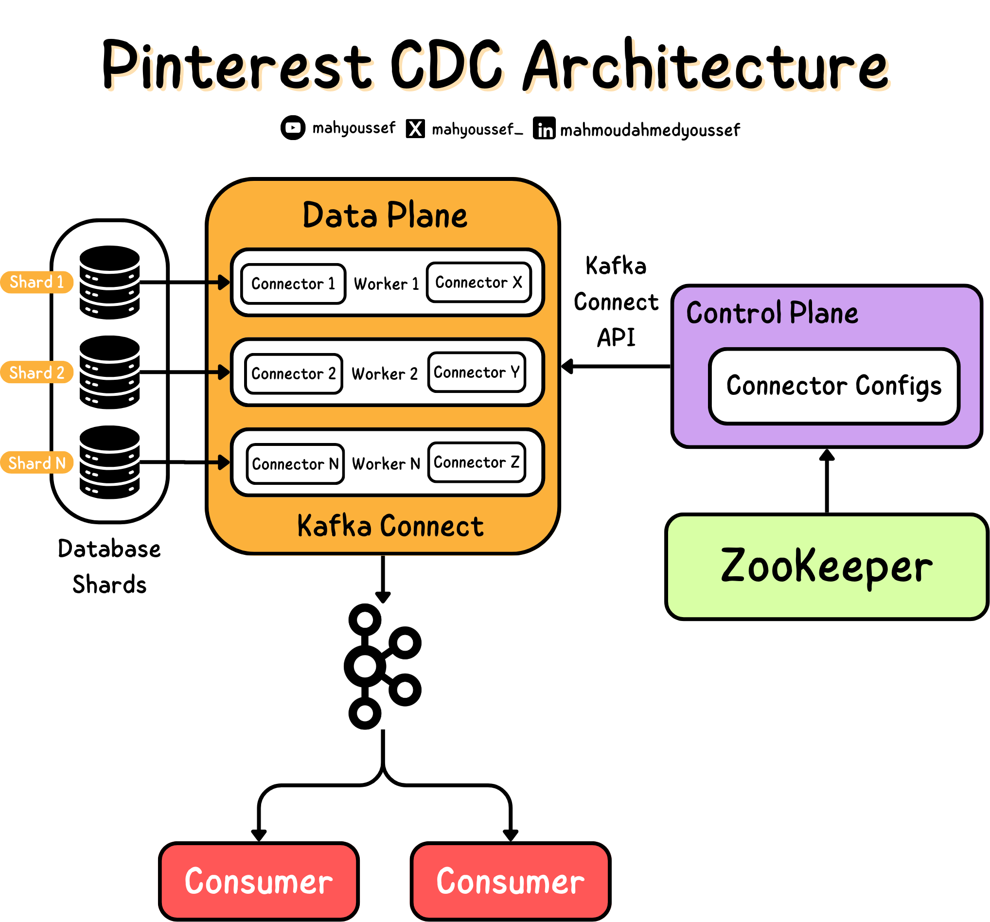 البنية التحتية لقواعد البيانات في Pinterest بتتميز بالتوزيع العالي Highly Distribution، وكل وحدة موزعة بنسميها shard. بعض قواعد البيانات الكبيرة ممكن يكون فيها حوالي 10,000 shard. وعلى الرغم من إن Debezium Connector المفتوح المصدر، زي MySQL Connector، بيشتغل بشكل سلس مع shard واحدة فقط.