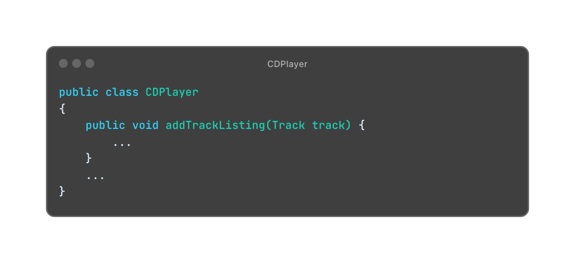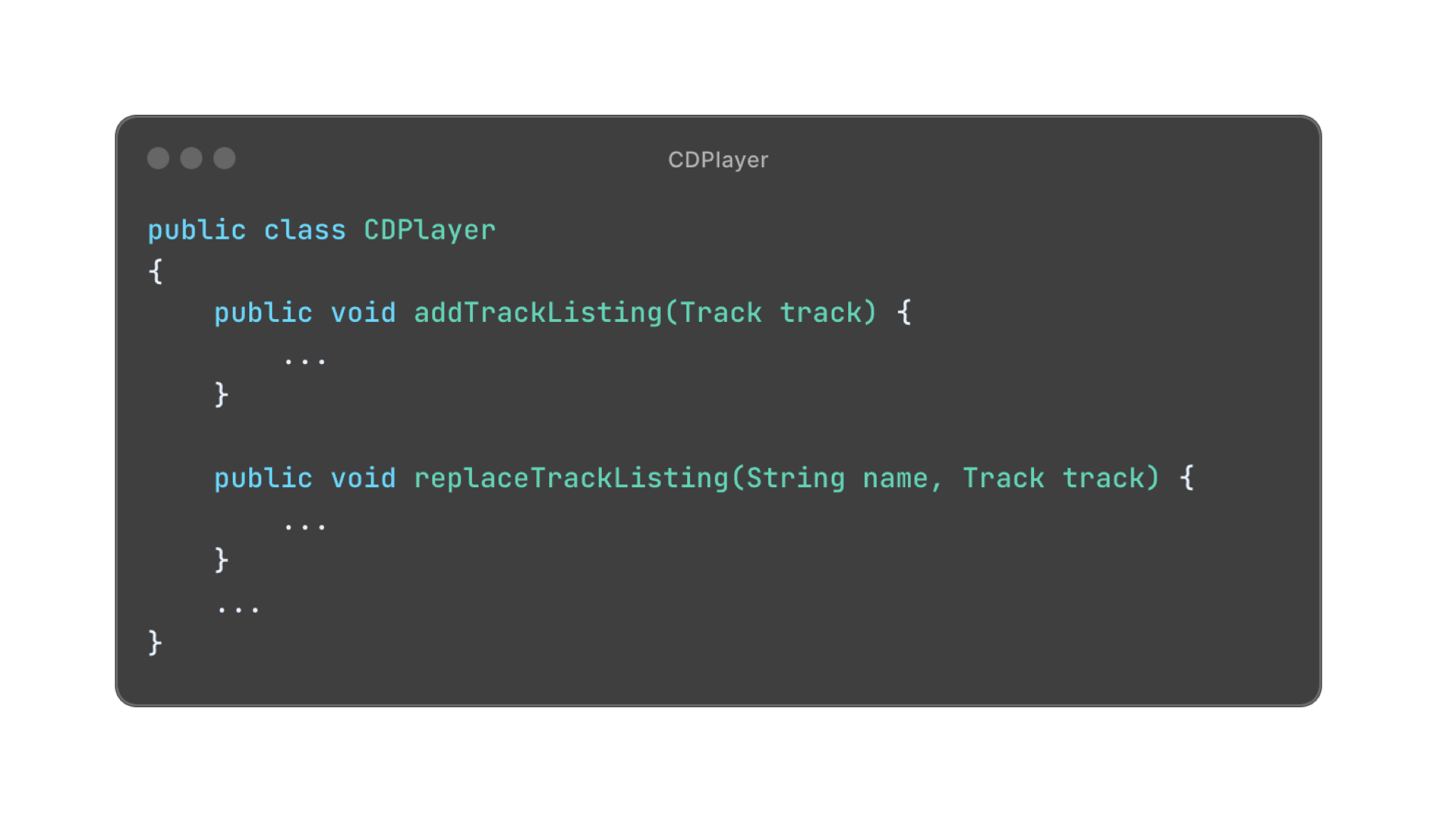 فلو جينا نبص على المثال ده هنلاقي ان عندنا Class اسمها CD Player وفيه Method واحدة بس اسمها addTrackingListing والـ Method دي بتتيح لينا ان احنا نضيف Track Listing.
