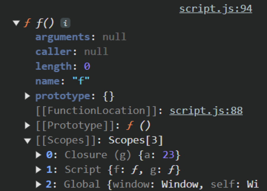 console.dir(f); // [[scopes]] -> closure -> {a: 23}