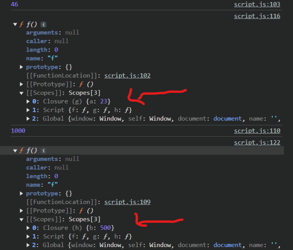 console.dir(f); // [[scopes]] -> closure -> {b: 500}