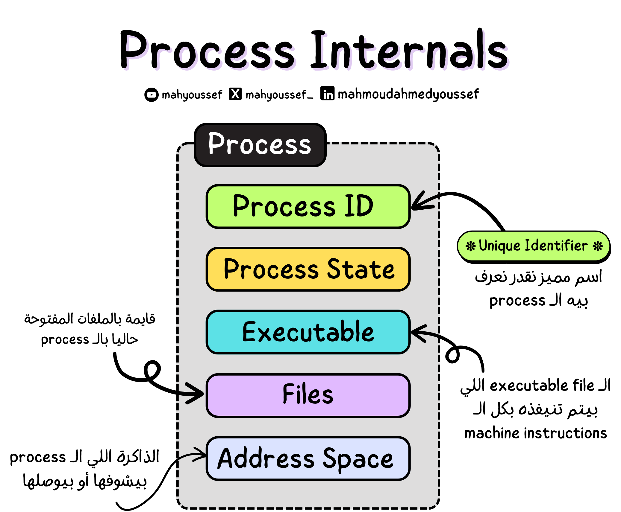 - الـ process كمان محتاج حاجة تعرفه: اسم مميز نقدر نعرف بيه الـ process. وده بنسميه الـ process ID (PID).