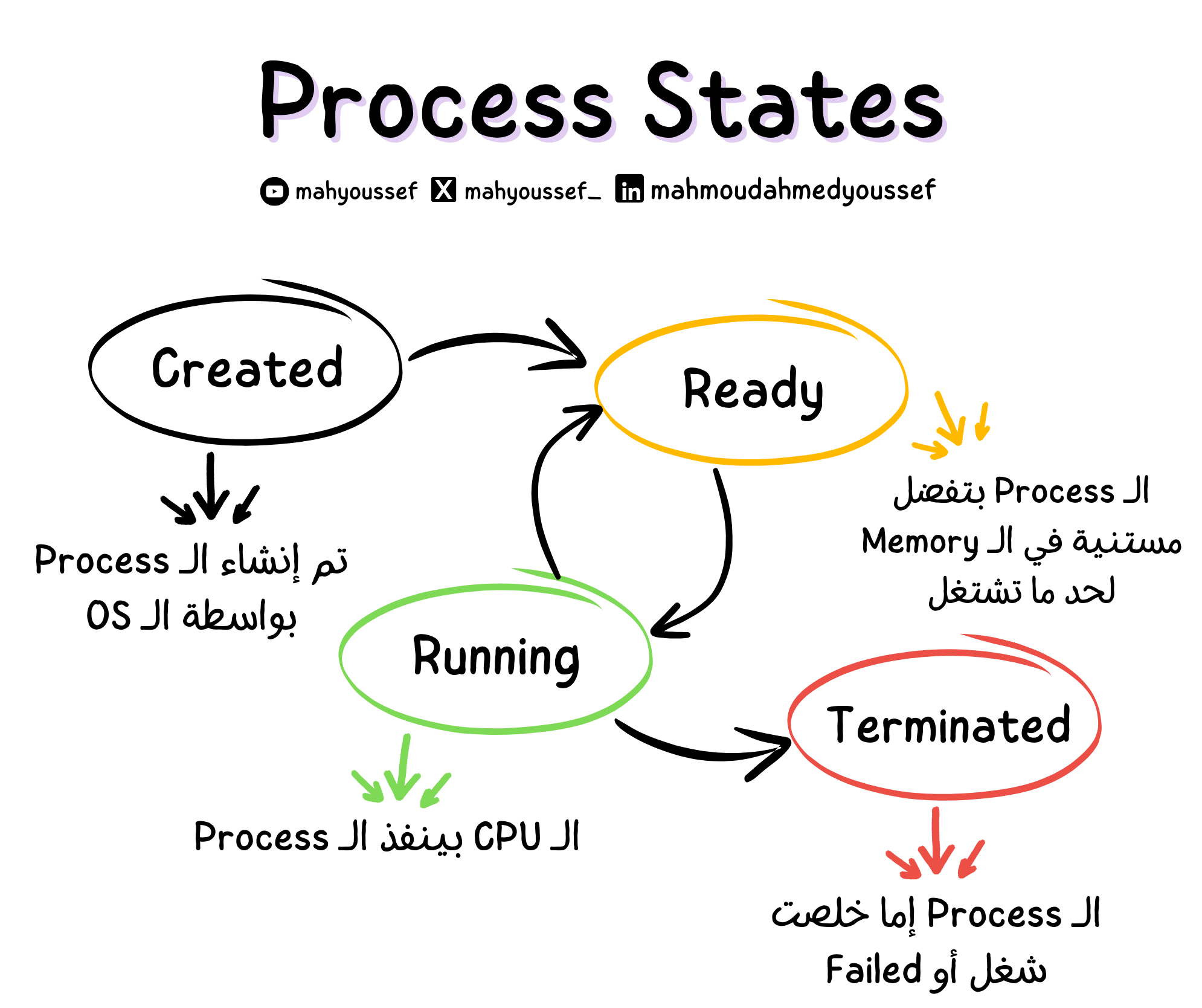 لما الكود بتاع المستخدم يبدأ process، الـ process بيروح لحالة الـ Ready—بيبقى جاهز إنه يتنفذ على الـ CPU في أي لحظة، بس لسه ما بيعملش حاجة. هو محتاج CPU عشان يبدأ التنفيذ.