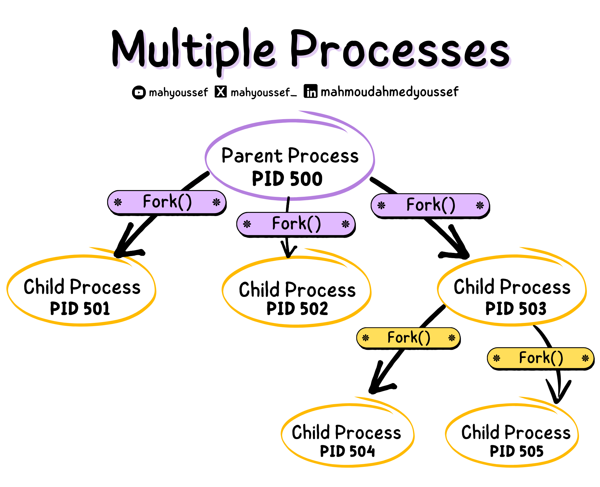 أي process ممكن تنشئ الـ processes الخاصة بيها —بنسميها child processes— عن طريق system calls زي fork() أو spawn() وبالتالي بنقول احيانا على العملية دي Forking أو Spawning.