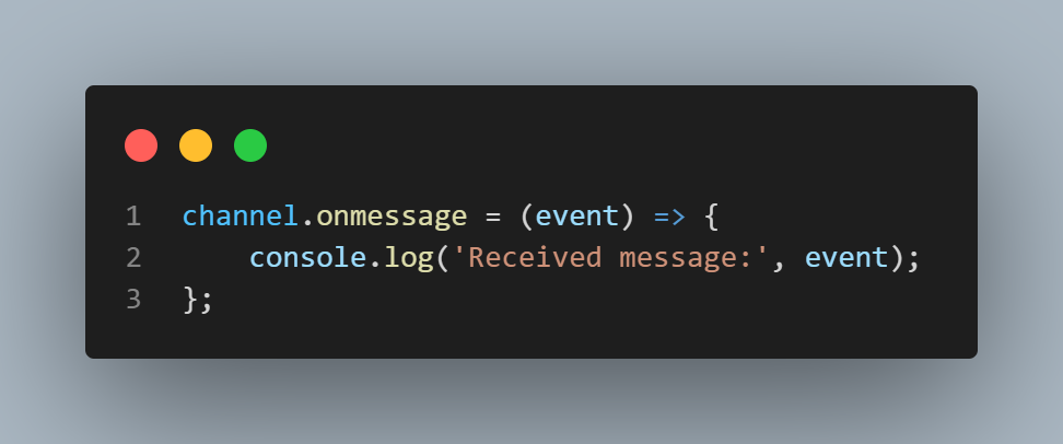 بحيث الـ function دى هى اللى هتـ run عند استقبال أي رسالة من علامات التبويب الأخرى وتستقبل parameter للـ event الخاصة بالرسالة دى (مش لازم تسميه event)، ونقدر من خلال الـ parameter دا نعرف تفاصيل أكتر عن الرسالة اللى استقبلناها.
