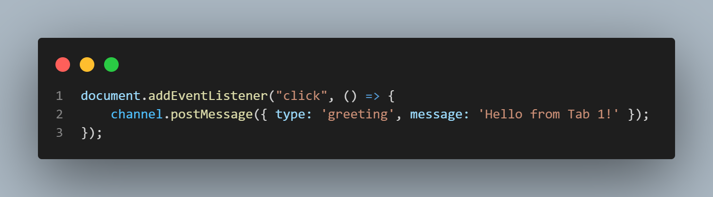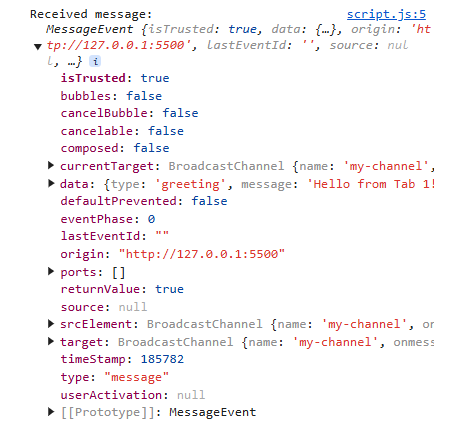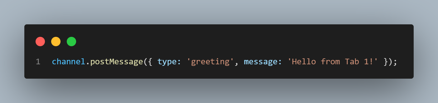 بحيث الـ postMessage method تستقبل مننا parameter بالبيانات اللى عاوزين نبعتها إلى باقي علامات التبويب، وفي المثال دا بنبعت لها object يحتوى على اتنين من الـ properties سميناهم type و message، وكان ممكن نبعت البيانات بأى شكل تاني (مش لازم object).