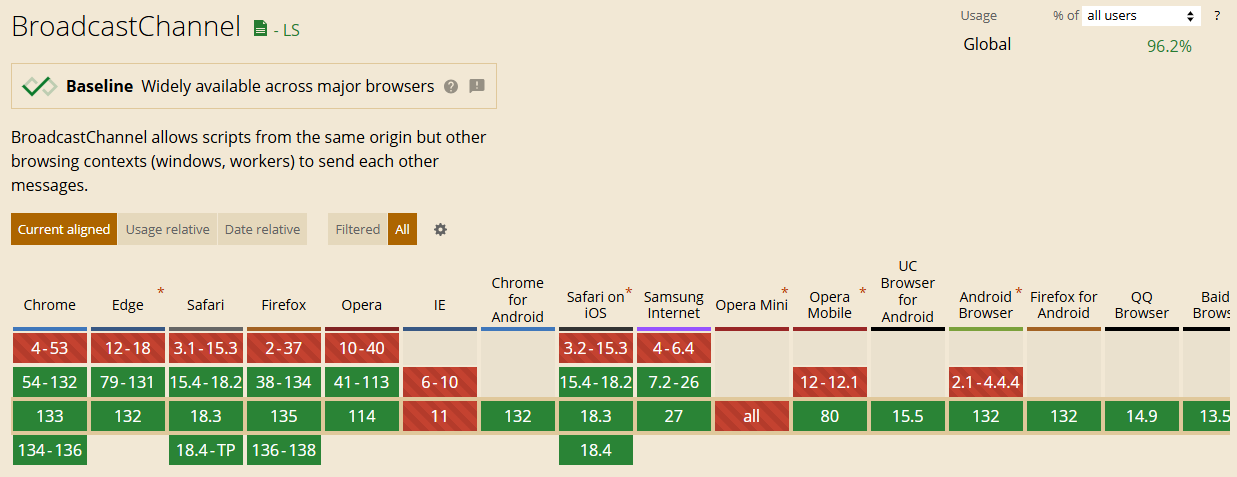 تبعا لموقع https://caniuse.com فالـ Broadcast Channel API متاح عند حوالى 96.2% من العدد الكلي لمستخدمي المتصفحات المعروفة، بالتالي تقدر تستخدمه في تطبيقاتك بدون قلق.