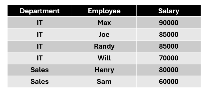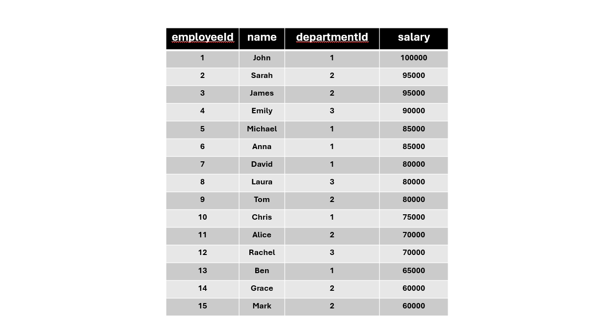 تعالوا نركز على قسم واحد بس في المثال وهو القسم اللي الـ ID بتاعته 1، إيه أعلى 3 أرقام مختلفين في العمود بتاع المرتب؟ 90000 و 85000 و 70000، المطلوب إننا نجيب كل اللي بيقبضوا أي مرتب من ال3 مرتبات دول، لو عندي أكتر من موظف بيقبض 90000 مطلوب نعرضهم كلهم ونفس الكلام للي بيقبضوا 85000 و 70000.