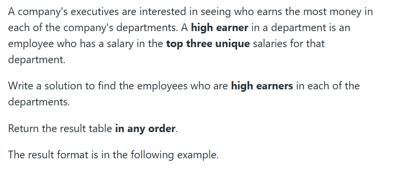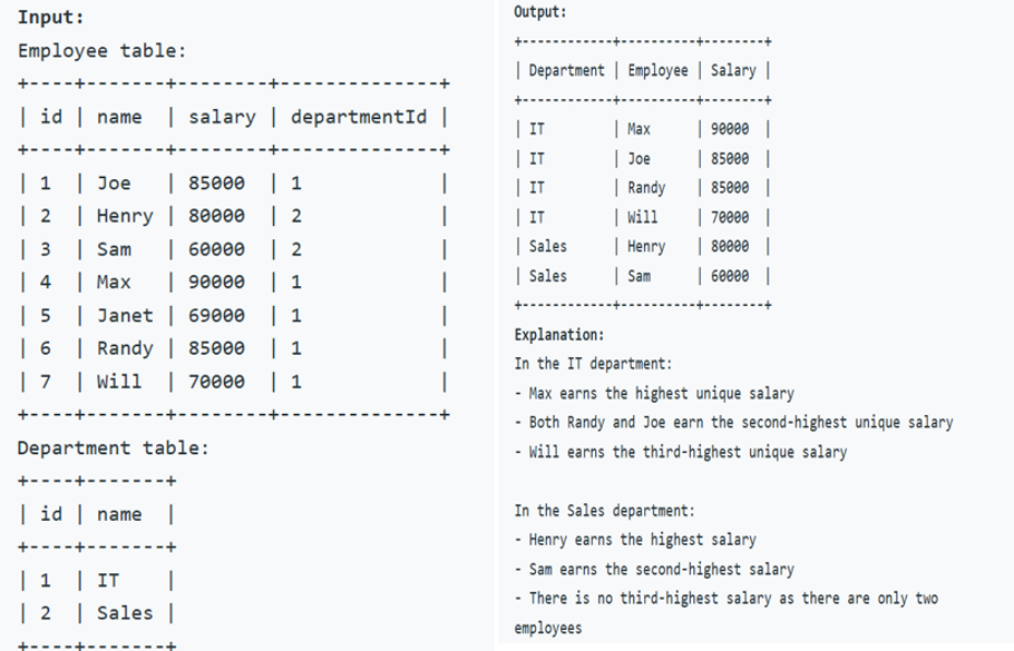 في السؤال بيقول إنه عايز يعرف الـ high earners في كل قسم وإن الـ high earner ده حد بيقبض مرتب من أعلى 3 مرتبات unique في القسم، يعني إيه الكلام ده؟ تعالوا نشوف المثال اللي اداهولنا تاني