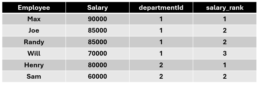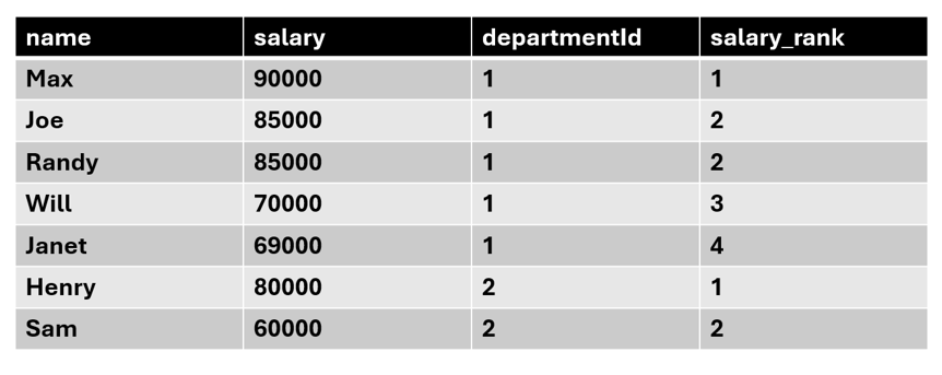 DENSE_RANK() OVER(PARTITION BY departmentId ORDER BY salary DESC) AS salary_rank