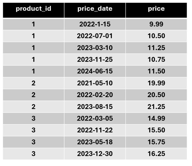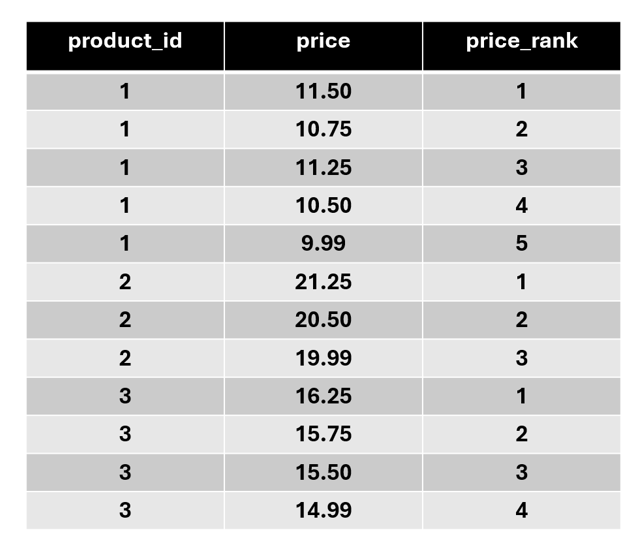 RANK() OVER(PARTITION BY product_id ORDER BY price_date DESC) AS price_rank