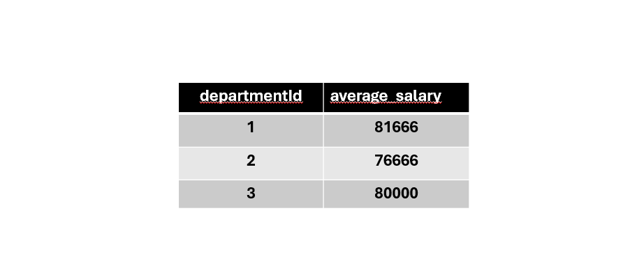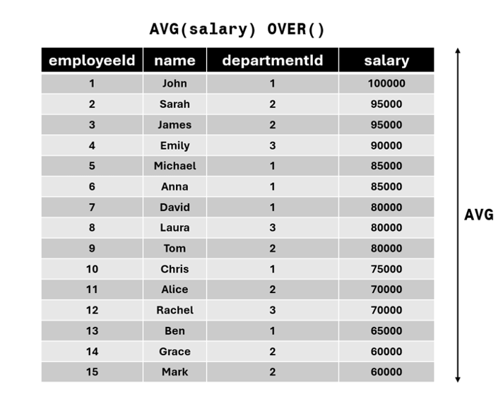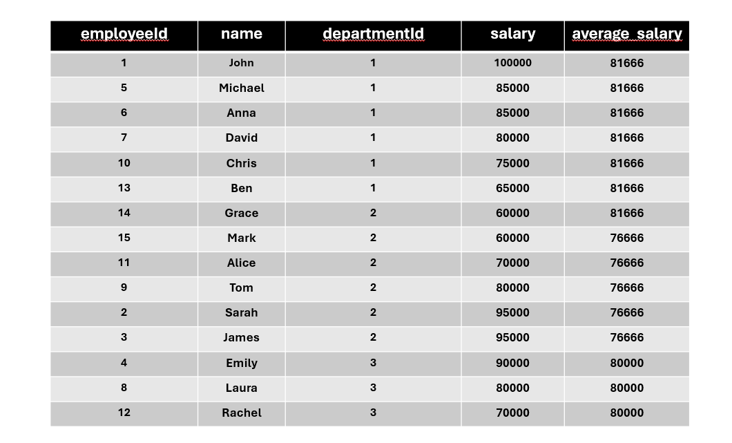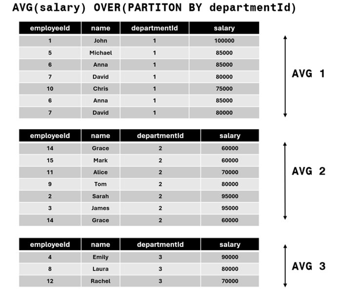 AVG(salary) OVER(PARTITION BY departmentId) AS department_average_salary,