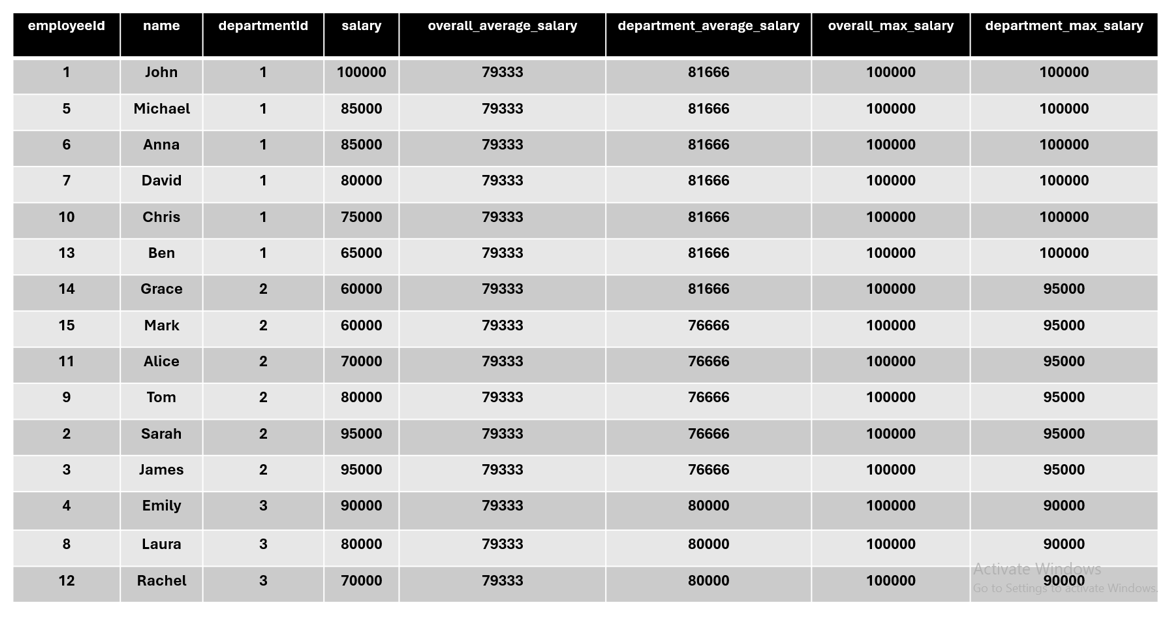 MAX(salary) OVER(PARTITION BY departmentId) AS department_max_salary