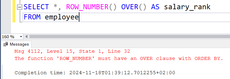 الايرور بيقولنا إن ROW_NUMBER لازم تستخدمها مع OVER ومعاها ORDER BY، إحنا في الكود استخدمنا OVER فمش دي المشكلة، زي ما قولنا إننا هنستخدم ROW_NUMBER, RANK, DENSE_RANK عشان تدي رقم لكل موظف على حسب ترتيبه في المرتبات بس في الكود اللي كتبناه مفيش أي حاجة ليها علاقة بترتيب المرتبات، محتاجين نقول للـ function الترتيب اللي بناءاََ عليه هتدي رقم لكل صف، وهنا ييجي دور حاجة كمان نقدر نستخدمها جوا OVER وهي ORDER BY، بنستخدم ORDER BY عشان نقول للـ window function على الترتيب اللي تمشي بيه، احنا هنا عايزين الـ function تمشي من أعلى مرتب للأقل فهنقول ORDER BY SALARY DESC، والكود هيبقى بالشكل ده: