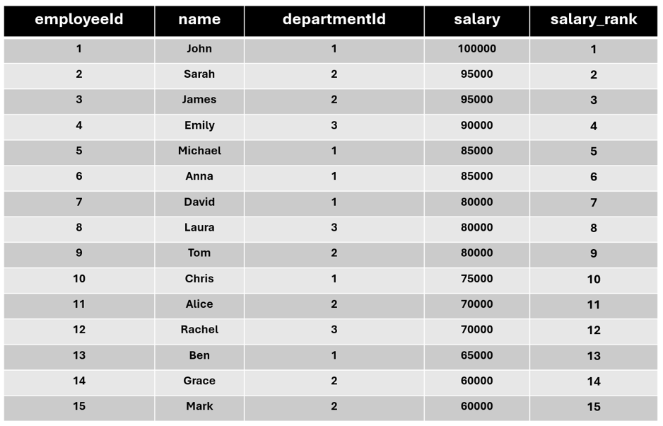 - جوا OVER استخدمنا PARTITION BY departmentId لأننا عايزين نعرف أعلى مرتبات لكل قسم، واستخدمنا ORDER BY salary DESC عشان نقول لـ DENSE_RANK تمشي بالترتيب من أعلى لأقل مرتب