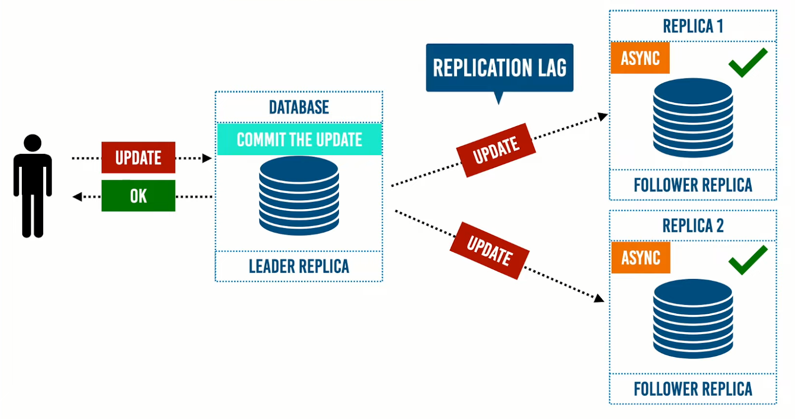 خلال ذلك الوقت -الذي يتم أرسال فيه التعديلات الى الـFollower Replicas ويتم عمل commit لهذه التعديلات في الـ Followers- ننتظر -مما يعني أن النظام يصبح في حالة inconsistent- لحين عمل commit للتعديلات عند الـ Follower Replicas، ووقت الانتظار حتى تصبح الـ Follower Replicas في حالة consistent يسمي Replication Lag وهو الوقت الذي يحتاجه النظام بدًأ من ارسال المستخدم التعديلات لحين الوصول لحالة الـconsistent بمعنى أن كل من الـLeader و الـFollowers يحتويان على نفس الـ data.