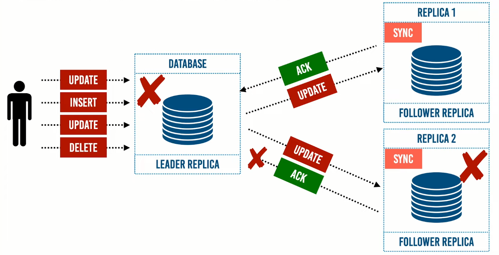 بالرجوع إلى حالة الـSingle Leader، إذا تم ارسال تعديلات الى الـLeader Replica، ثم يتم عمل commit إلى هذه التعديلات، ويتم إبلاغ المستخدم بأن هذه التعديلات تمت علي الـdata، ثم تقوم الـLeader Replica بإرسال هذه التعديلات إلى الـFollower Replicas.
