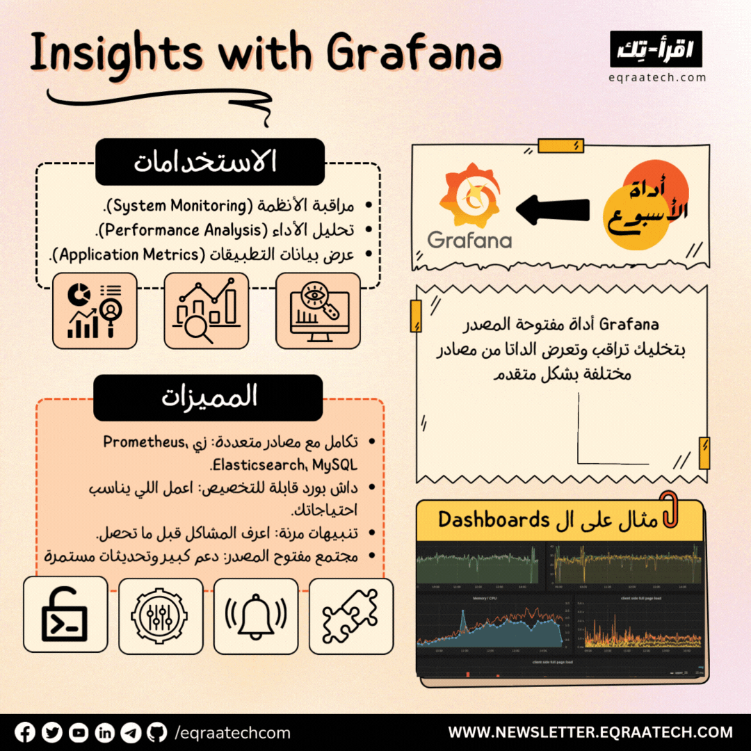 Grafana هي أداة مفتوحة المصدر بتخليك تراقب وتعرض البيانات من مصادر مختلفة بشكل متقدم وعرضها في لوحات تحكم تفاعلية (Dashboards). وتُجمع البيانات من مصادر مثل: قواعد البيانات، و خوادم التطبيقات، وأجهزة إنترنت الأشياء (IoT)، وغيرها، بطريقة سهلة الفهم و مناسبة لاتخاذ القرارات.