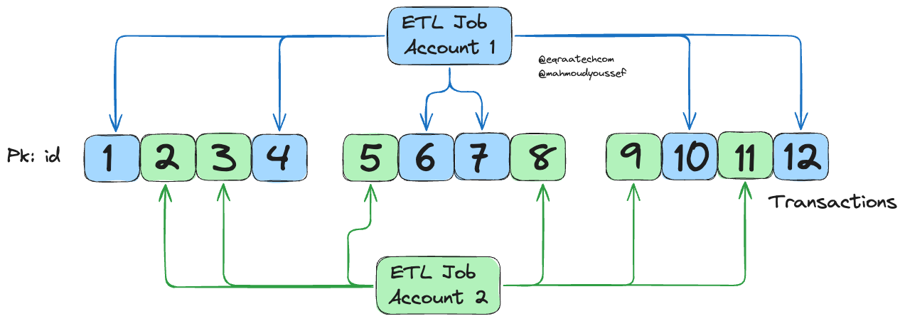 الصورة دي بتوضح جدول اسمه transactions. الجدول ده بيتم تحديثه بشكل متزامن عن طريق عمليات ETL بتشتغل على كل account بشكل مستقل. ورغم إن كل عملية بتستهدف مجموعة مختلفة من الـ Records في الجدول transaction، إلا إن متطلبات الـ Locks بينهم ممكن تتداخل وتسبب "deadlocks".