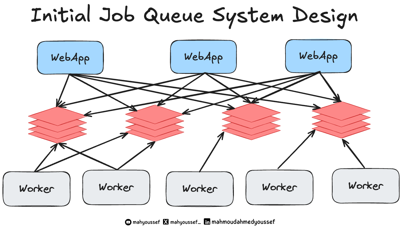 الـ Redis connections كانت عاملة complete bipartite graph: كل client (أي system بيعمل enqueue) لازم يكون متصل بـ كل Redis instance. وده معناه إن كل client لازم يعرف كويس كل تفاصيل Redis nodes، ويكون عنده config مظبوط ومحدّث دايمًا.