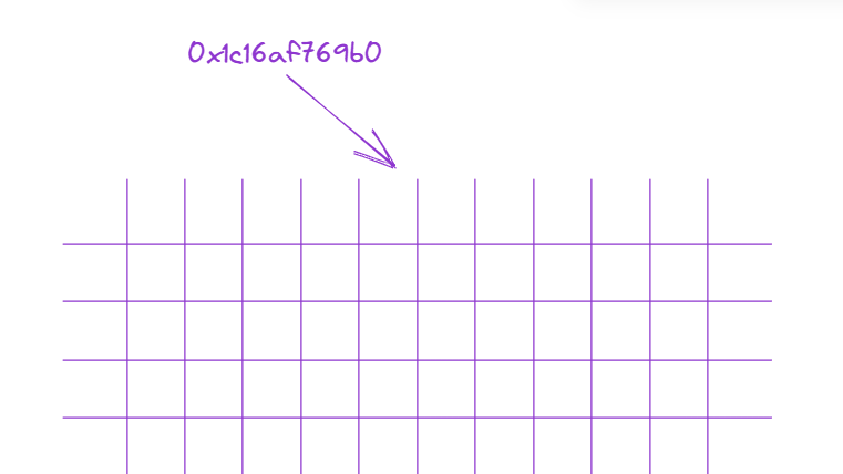 الشكل التالي توضيح لذاكرة الكمبيوتر، كل مربع في الصورة هو مكان لتخزين المعلومات و 0x1c16af76960 هو عنوان المكان المشار إليه.