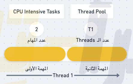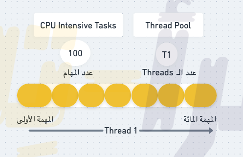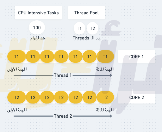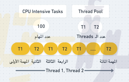 الآن دعونا نفترض أنه بدلًا من وجود Thread واحد فقط لدينا في الـ Thread Pool , يوجد الآن 2 Threads وعدد المهام المطلوبة كما في المثال السابق ١٠٠ (مائة).