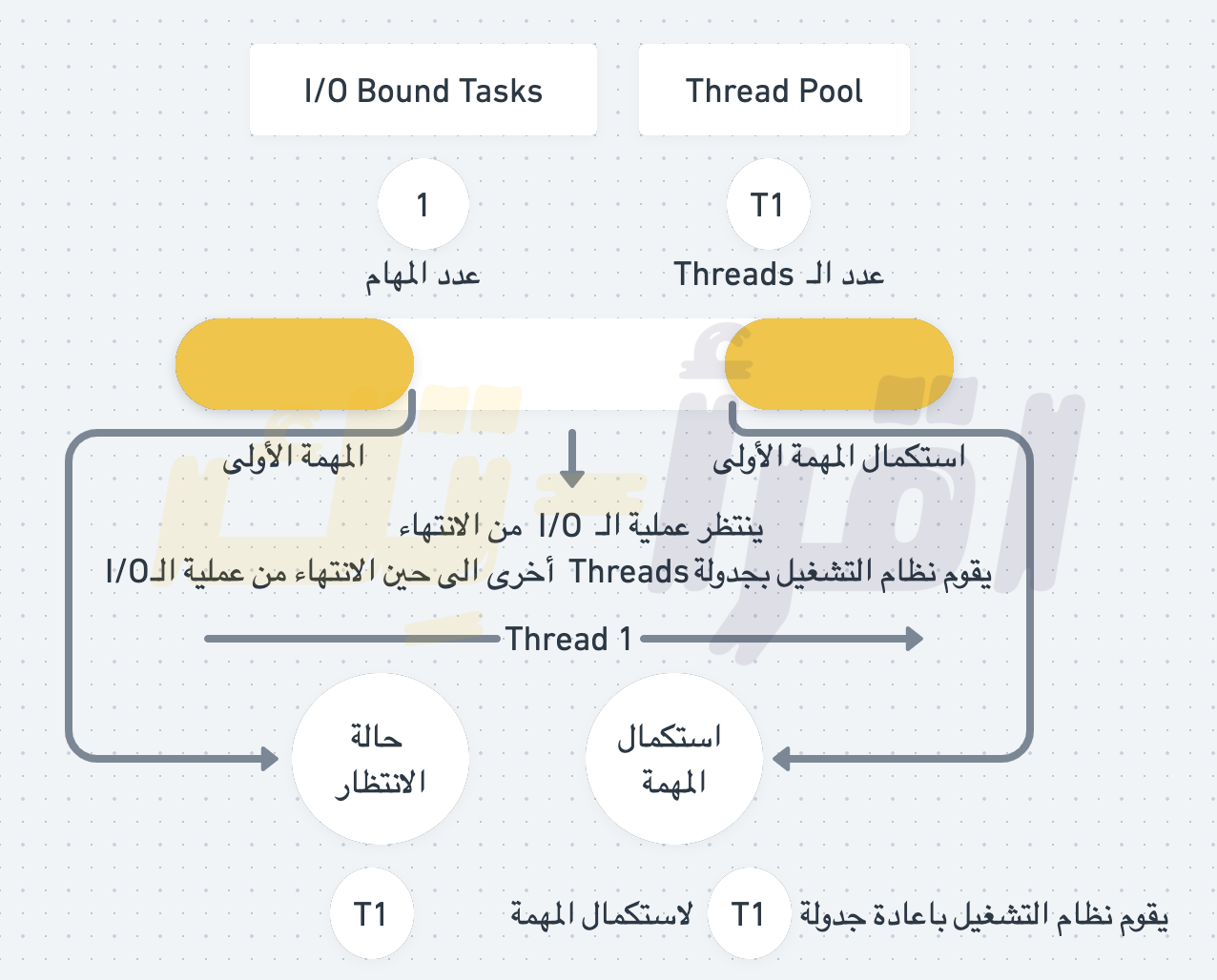 فكما نرى في الصورة السابقة يقوم نظام التشغيل بجدولة Threads أخرى لتعمل حتى تنتهي عملية الـ I/O ويقوم باسترجاع الـ Thread المنتظر لاستكمال المهمة التي كان موكل للقيام بها وتنفيذها.
