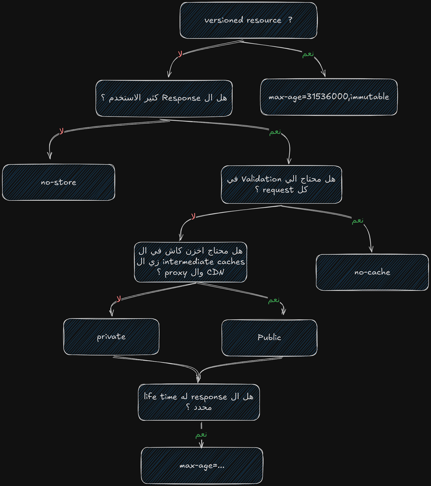 وفي الحالات دي بنعمل set ل الـ Cache لأطول فترة ممكنة (Cache-Control: max-age=31536000) ودا لانه مع كل مرة بيحصل build بيحصل versioning لاسامي الفايلان وبالتالي الـ browser بيروح يجيب النسخة الجديدة من الـ resource ويخزنها عنده مره ثانيه .