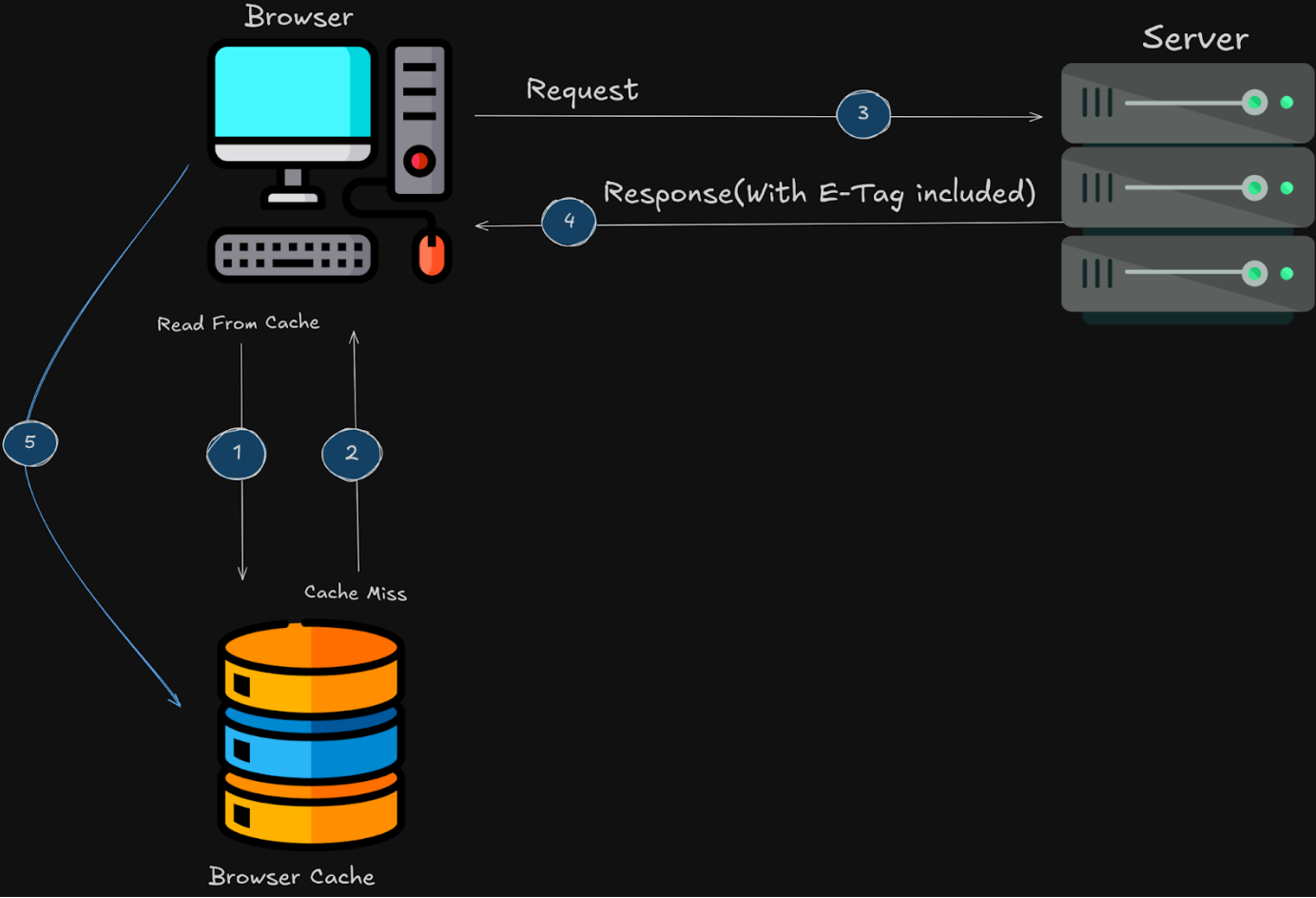 بعد أول request ال browser بيعملة الـ server بيرجع مع الـ response header حاجة اسمها الـ E-Tag وهو عبارة عن string بيمثل Hash ل الـ resource الي راجع في الـ response وبيتغير في كل مرة بيحصل تعديل على الـ resource دا في الـ remote server.