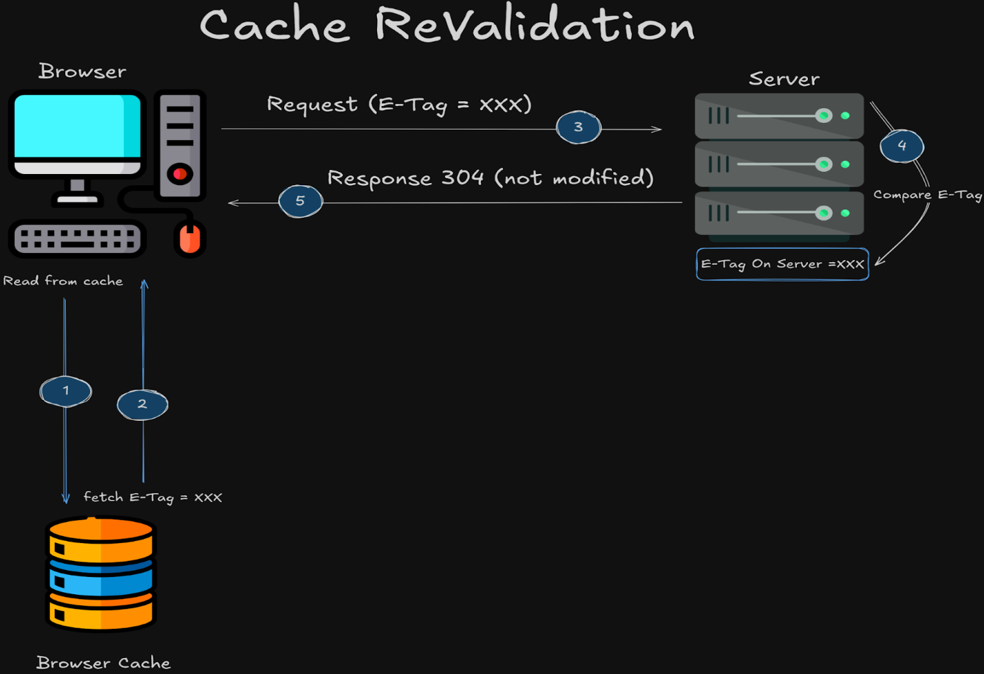 وبعد ما بيستلمه من ال browser بيبدأ يخزنه في الـ Cache Database علي جهاز المستخدم ويبدأ الـ browser يعرضه للمستخدم في المرات القادمه اللي بيبعت فيها المستخدم يطلب نفس الـ resource من الكاش بدون ما يضطر يبعت request ل الـ server مرة كمان، وهنا بيجي سؤالـ مهم هو الـ browser بيعرف منين إنه الداتا اللي متخزنة في الكاش updated وأنه الـ cache الي عنده هي اخر نسخة موجودة على الـ server ؟ الاجابة علي السؤال دا تتلخص فيما يسمى Cache Revalidation