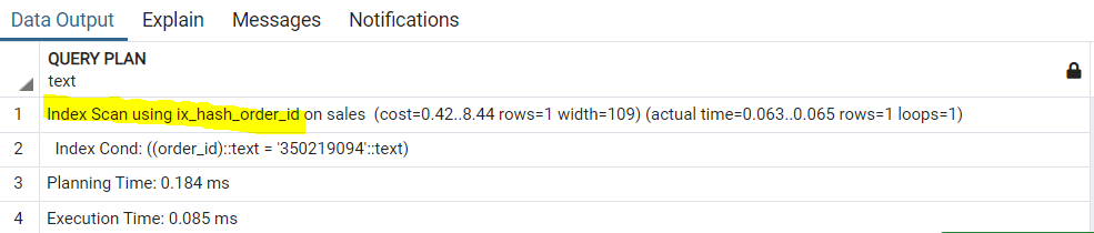 والمفاجاة هنا أن الـ Response هيرجع بسرعة جدًا .. تقريبًا 50ms .. من وسط 1,048,575 قدرت الـ Database انها ترد عليا في 50ms ولكني لا أعرف السبب .. وحتى افهم ذلك بشكل أفضل سنقوم باضافة EXPLAIN ANALYZE ولكننا سنتفاجئ هنا بشيء غريب ألا وهو .. أن في الـ Query Plan الذي سينفذها الـ DBMS نرى أنه سيقوم بعمل Index Scan ولكن هذا غير منطقي ، لاني وبكل بساطة لم أطلب منه بعد عمل Index ..