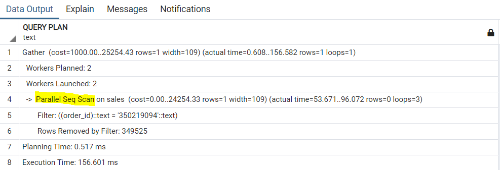 إذا قمنا بارسال نفس الـ Query مرة أخرى الآن .. سنجد انها يتم تنفيذها في وقت سريع ايضًا على الرغم من مسح الـ Primary Key أي أن الـ Clustered Index تم مسحه .. ولكن الـ DBMS مازالت ذكية وتحاول انها تـ Return الـ Response بأسرع شكل ممكن وذلك من خلال استعمال الـ Run Workers حتى يتم تنفيذ الـ Query بشكل أسرع وذلك عن طريق الـ Parallelism ..