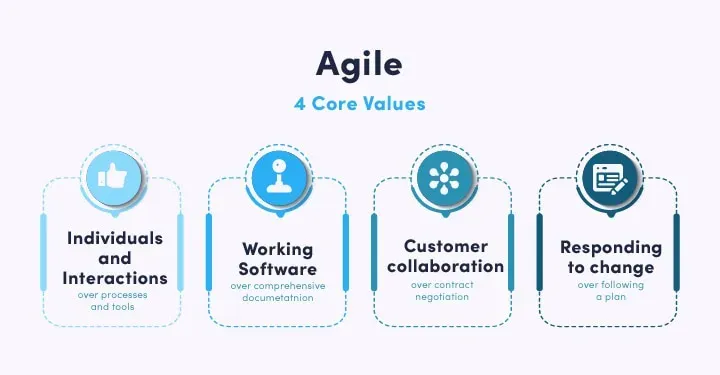 وفقًا للبيان الرسمي للAgile، هناك أربعة قيم أساسية و12 مبدأ توجيهي تُحدد فلسفة الAgile:
