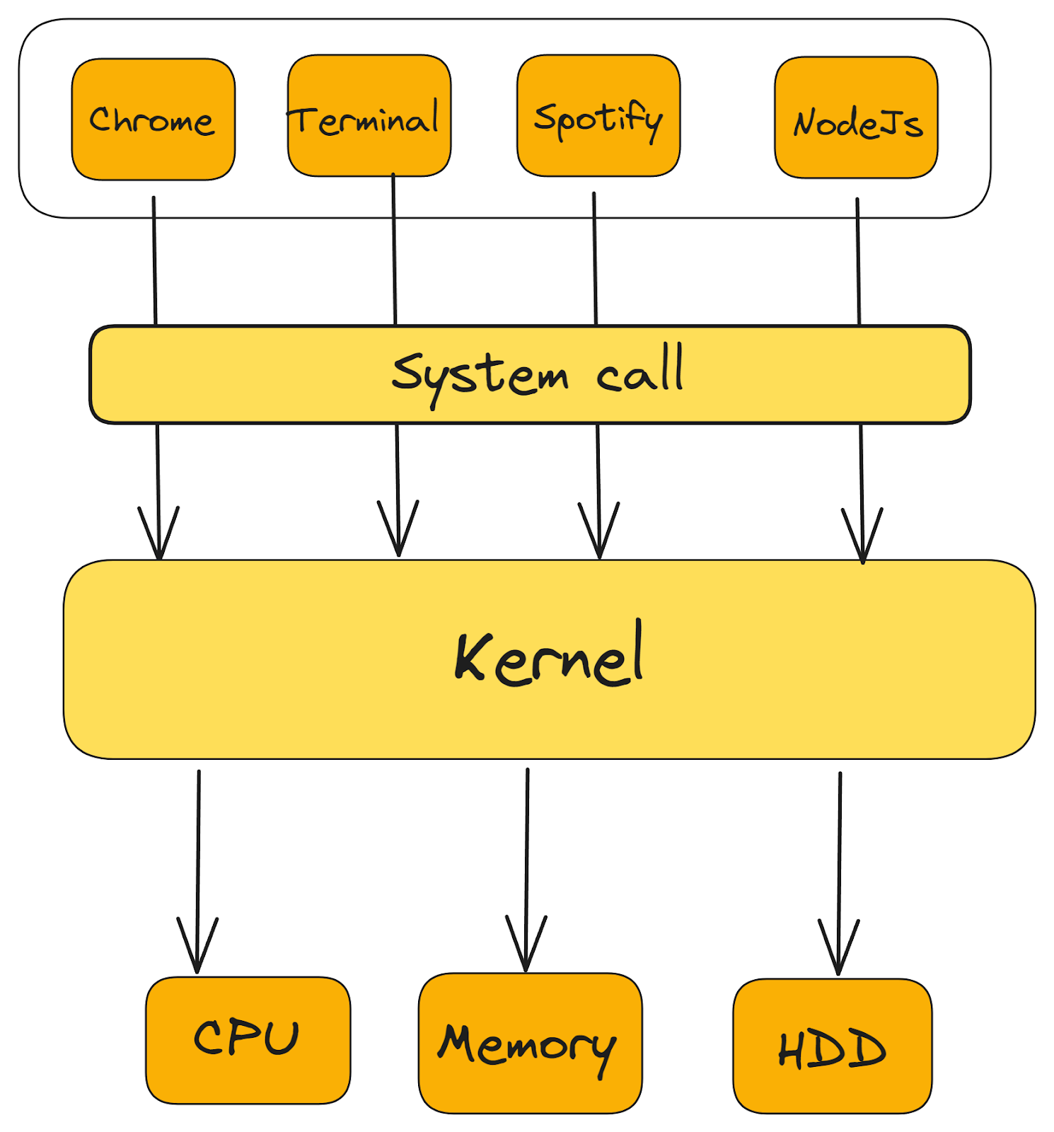 وخلاف ذلك من المكونات، بالإضافة إلى نظام التشغيل (Operating System) أيًا كانت نسخته (MacOS أو Windows أو Linux وغيرهم) بالإضافة إلى الـkernel (هو عبارة عن Software مسؤول عن إدارة تلك الموارد التي تم ذكرها وتخصيصها بشكل مناسب لكل Process تعمل على جهازك، والـProcess بالمناسبة هي أي ملف يقوم جهازك بمعالجته Execution عن طريقة الـCPU ويقوم بعمل بتحميل بياناته في الذاكرة العشوائية مثل أي برنامج أنت تستخدمه مثل chrome, Spotify, MS word وغيره).