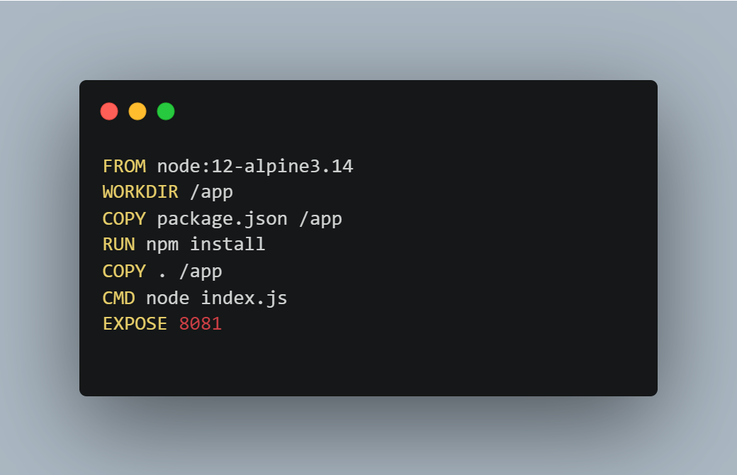 لكن أولًا، عليك بتحميل Docker engine قبل أي شئ ومن خلاله ذلك سيساعدك في عمل Pull أو Build لأي Image تريدها، والـImage هنا عبارة عن Snapshot تحتوي على كل الملفات والـpackages وباقي الأشياء الخاصة بأي Application، حينها يمكنك رفع تلك الـImage على منصة خاصة برفع تلك الـDocker images مثل Docker Hub أو بإمكانك إنشاء Dockerfile في الـCodebase وستطلب من الذي سيستخدم ذلك الـCode لبناء تلك الـImage (الـDockerfile يعتبر ملف تصف فيه التعليمات التي يلتزم بها Docker engine عند بنائه الـImage الخاصة بذلك الـCode)، ومثال على ذلك هو الملف الآتي: