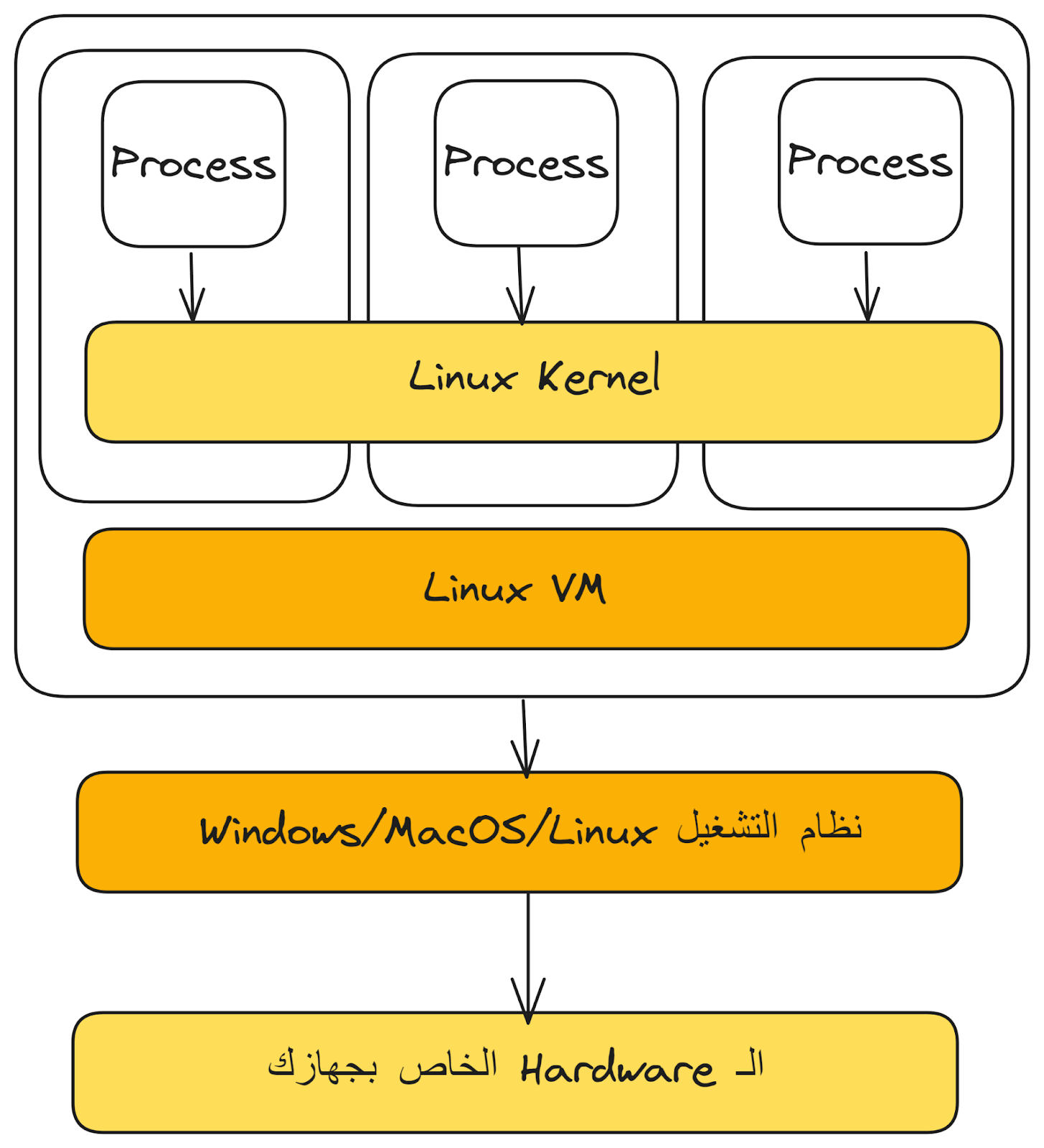 عندما تقوم بتنصيب Docker Server. سيقوم بتنصيب أيضًا Virtual Machine وسيعمل عليها Linux التي ستقوم بدورها باستضافة جميع الـContainers دي بجانب نظام التشغيل الأساسي الذي تعمل به، وجميع الـcontainers يمكنها أن ترى بيانات بعضها البعض لأنها تعمل تحت نفس نظام التشغيل، والتواصل يحدث بينهم من خلال عملية تعدى Inter-process communication، لذلك فقد ذكرت مسبقًا أن الـContainers تكون“منعزلة نسبيا”، وليس كليًا مثل الـVM لإنها لن تسمح بحدوث ذلك من الأساس وتلك واحدة من مميزات الـVM وهي الأمان.