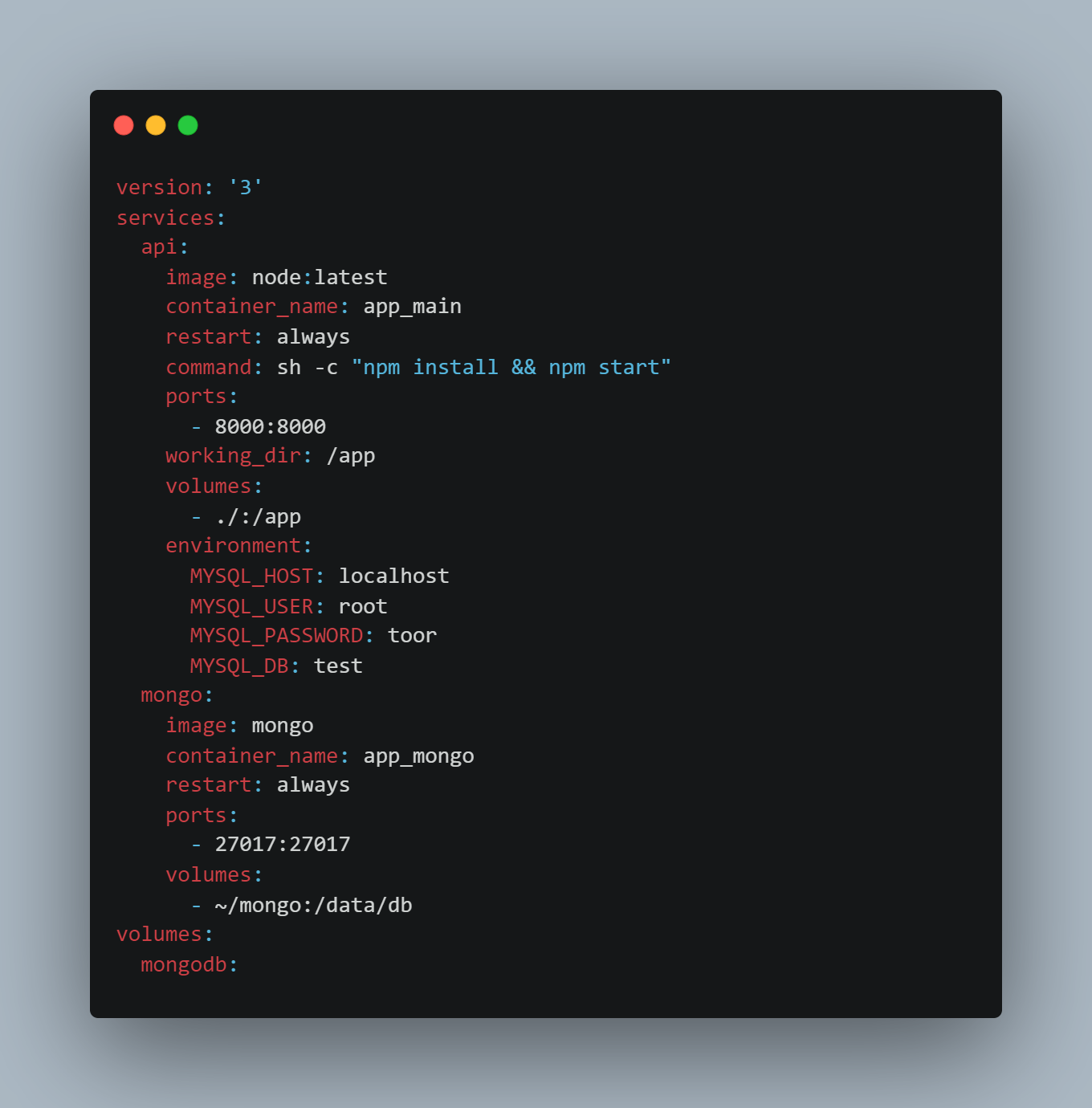 - سنقوم بتعريف مجموعة من الـservices، وهي الـimages التي تريد بنائها في هذه الحالة مثل api و mongo (قاعدة البيانات).