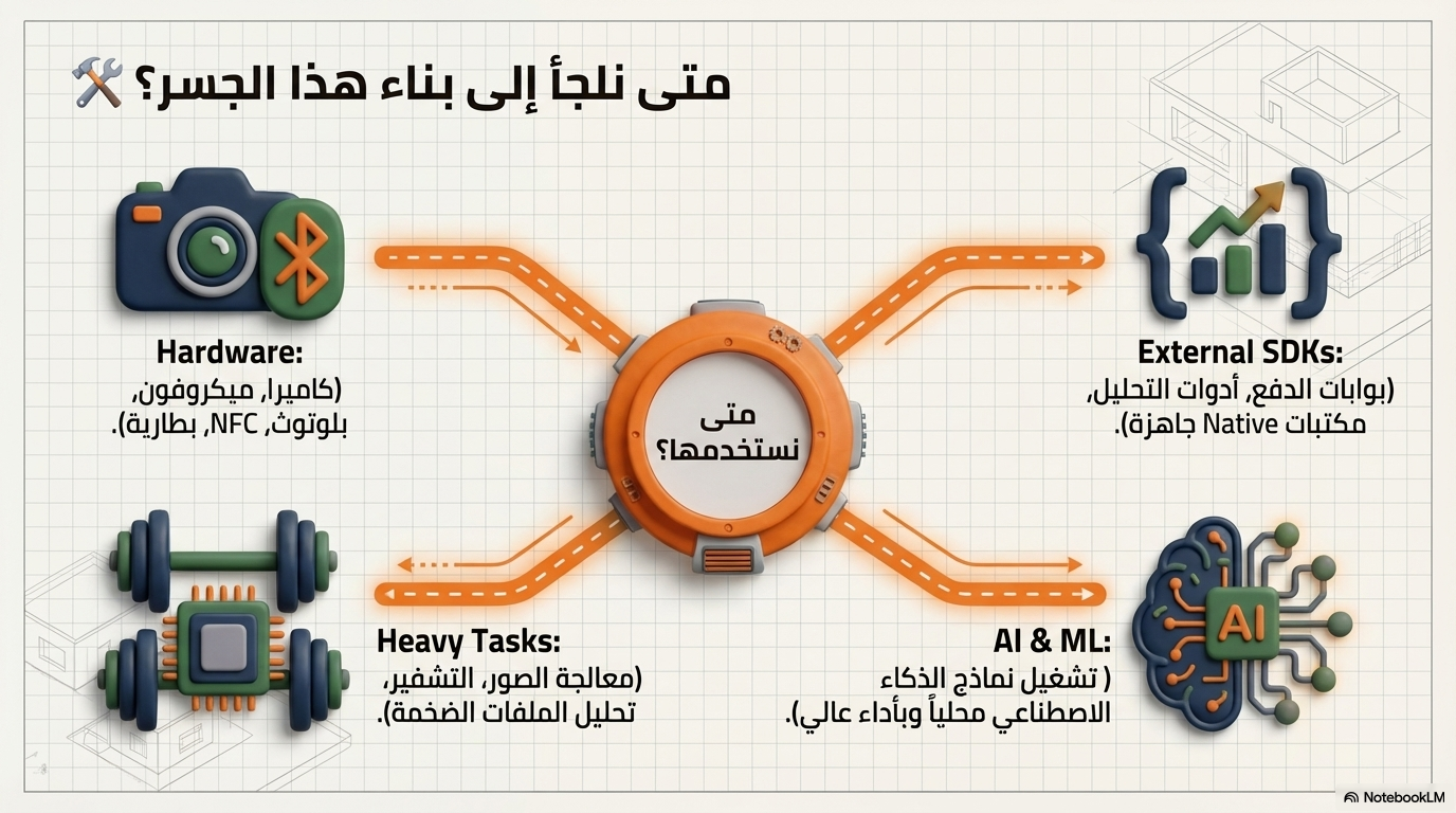 - دمج مكتبات Native جاهزة: زي بوابات الدفع أو أدوات التحليل