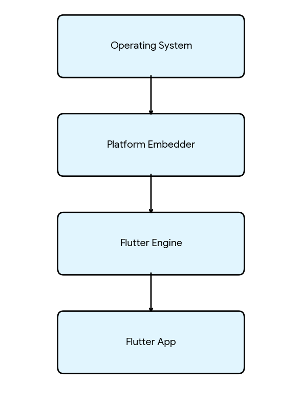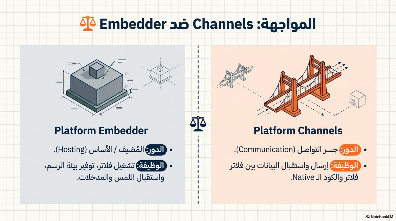 - Platform Embedder مسؤول عن تشغيل Flutter وربطه بالنظام (تشغيل + رسم + inputs)