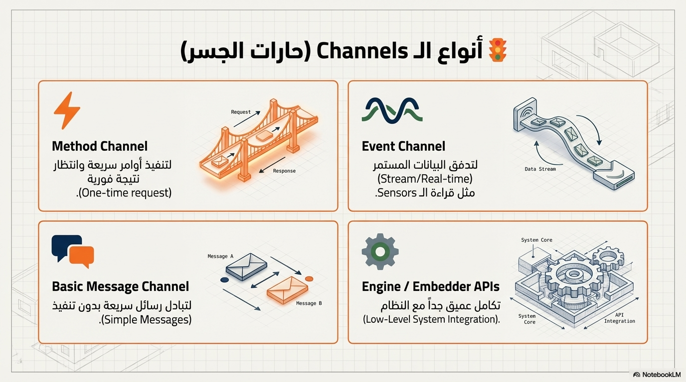 - Platform Channels مسؤولة عن التواصل بين Flutter والكود الـ Native (إرسال واستقبال بيانات)