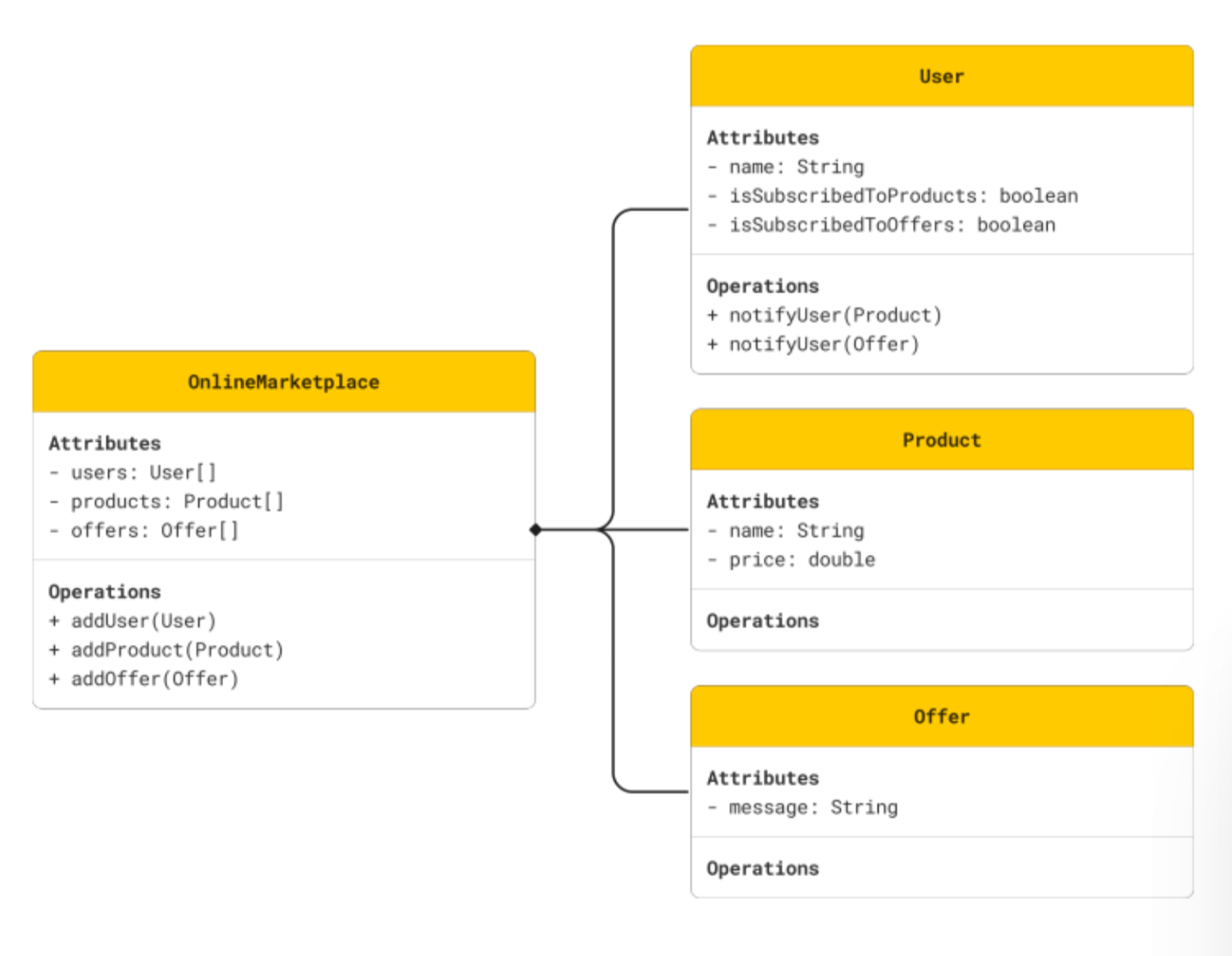 اول حل جه في بالي هو اني عملت OnlineMarketPlace وخليت يبقى عندي User , Product , Offer والعلاقة بينهم Composition لان الـ Online Market Place is Composed of Users ,Products , Offers