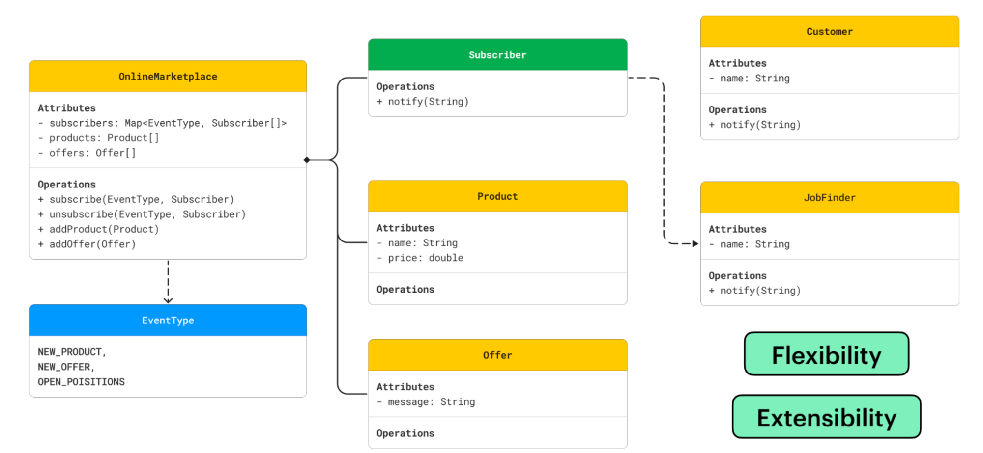 اما بالنسبة لتالت مشكلة فهي الـ Extensibility: فتخيلوا معايا اني لو حبيت اضيف نوع جديد من الـ Subscription وليكن عاوز ابعت Notification لما يكون عندي وظايف شاغرة ومحتاج عمال وموظفين. هعمل ده ازاي ؟ هضطر اروح اعمل Field جديد واغير في كل مكان واقول isSubscribedToJobOpennings وبالتالي ده هيـ Violate Open Close Principle ..