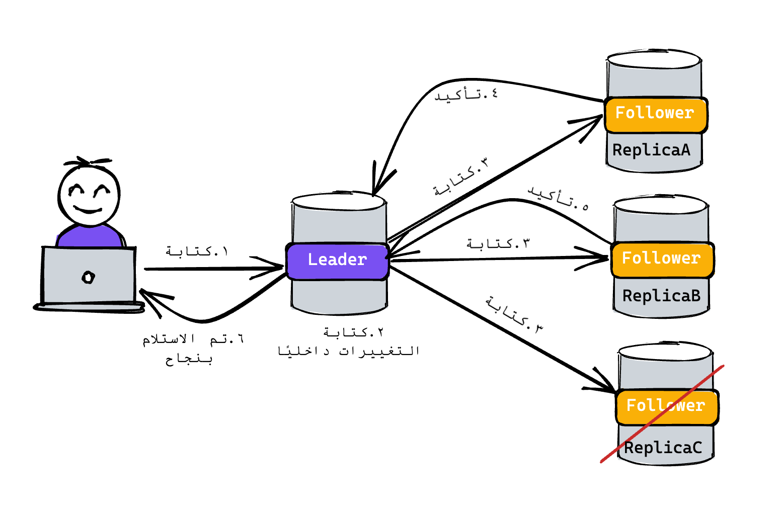 ورأينا النوع الآخر أيضًا والذي يقوم بالرد على المستخدم بمجرد استلام الـ Leader Replica للتغييرات ومن ثم يقوم فيما بعد بعملية التزامن دون أن يؤثر على المستخدم.