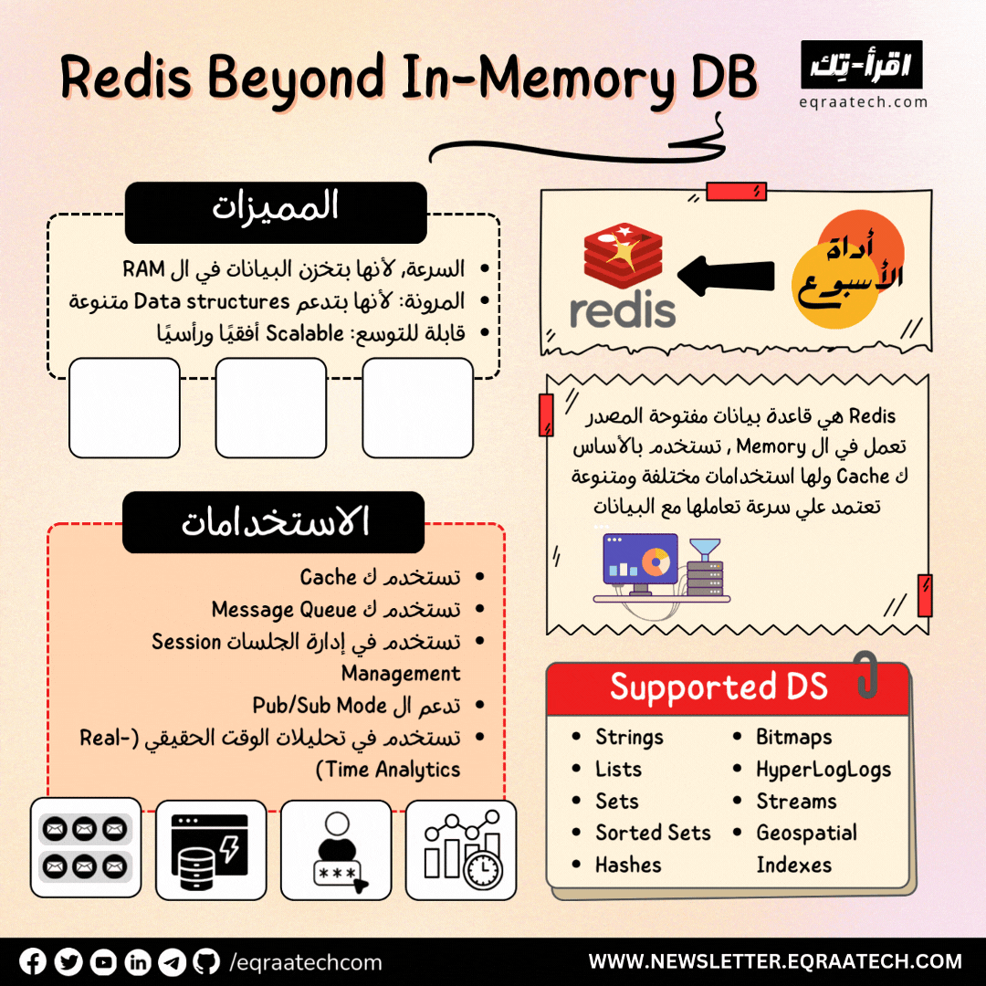 كمان ليها استخدامات ثانية كثيرة نعرفها لأنها أداة مرنة بتخزن جميع أنواع البيانات ك Key-Value Pair وتتيح لك هياكل البيانات الأساسية واللي تقدر تستخدمها في تطبيقات متنوعة.