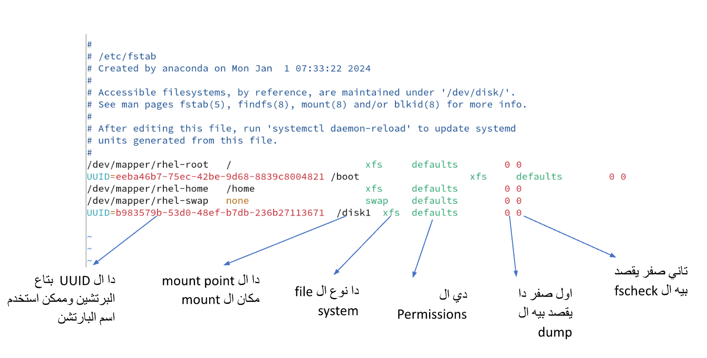 [root@mostafa ~] vim /etc/fstab[root@mostafa ~] mount -aالـ mount -a الامر داب يعمل mount لل configfile من الأول عشان لو فيه أي تعديل يعملها