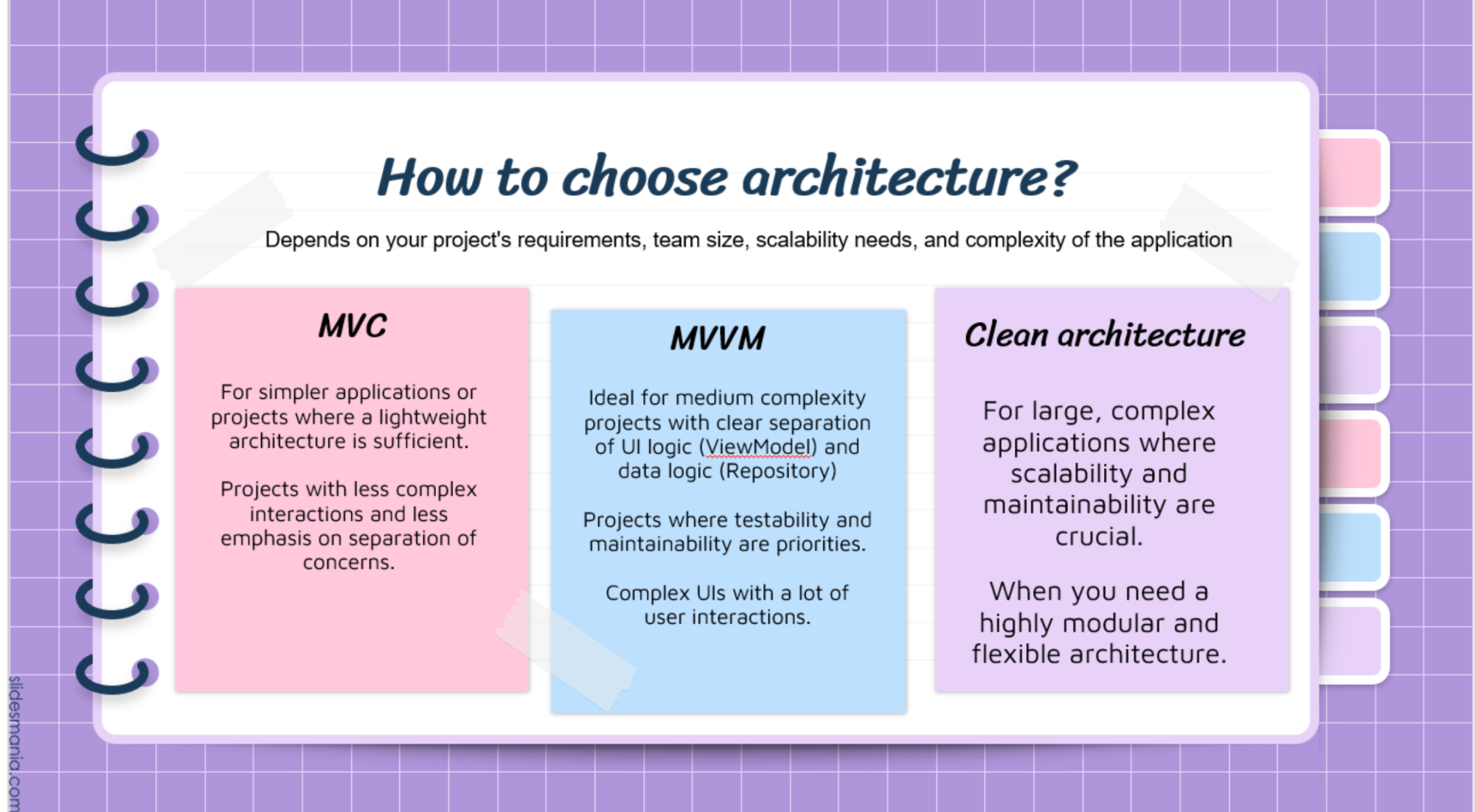 MVVM , Clean acrchitecture بس دا ميمنعش ان حد ممكن يستخدم MVC عادي.