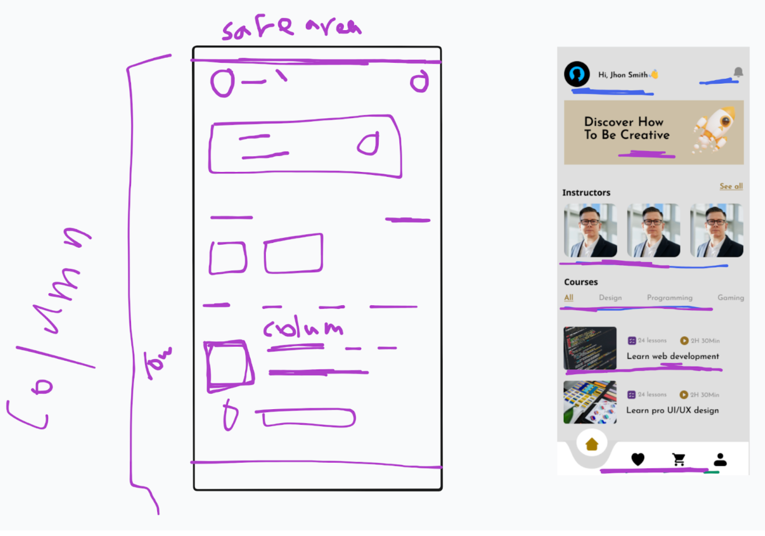 - أول حاجة بفهم التصميم كويس جدًا، أدرس الـflow بتاعه وأفهم فكرته والهدف منه علشان اعرف اكون فكرة عنه في دماغي و اشوف همشي فيه ازاي.