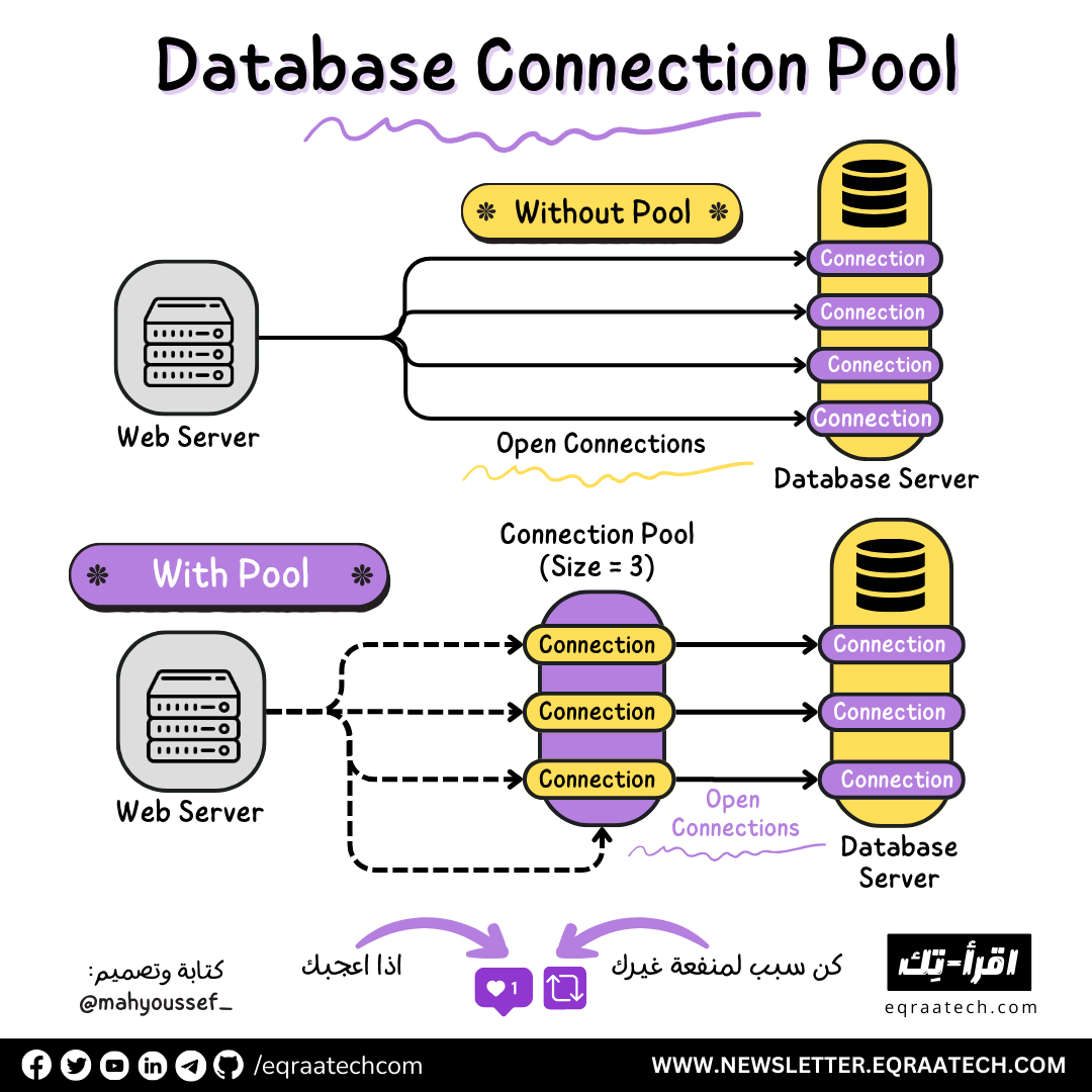 الميزة الكبيرة إنك بتحدد عدد الاتصالات اللي تقدر تتفتح في نفس الوقت، وده بيمنع إنك تحط قاعدة البيانات تحت ضغط عالي. كمان الـ Pool بينظم الطلبات وبيقلل استهلاك الموارد.
